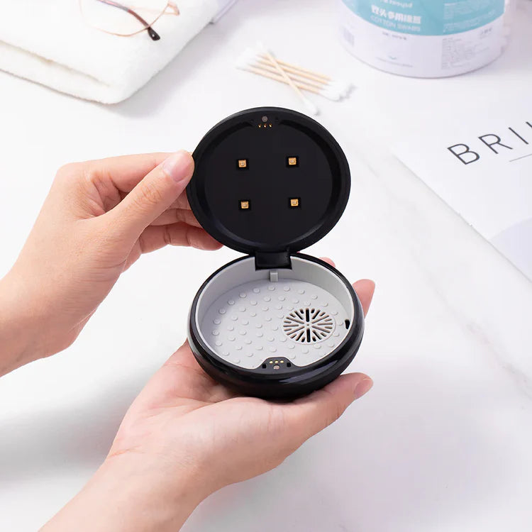The UVC Denture Travel Case is a compact, portable sterilization box designed to deep-clean dentures, retainers, and mouthguards using ultraviolet (UV-C) light. It eliminates harmful bacteria and odor-causing germs in minutes—without soaking tablets, harsh chemicals, or messy solutions.