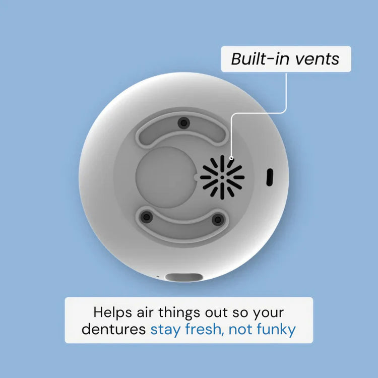 ✔ Sanitizes and securely stores your dentures, protecting them